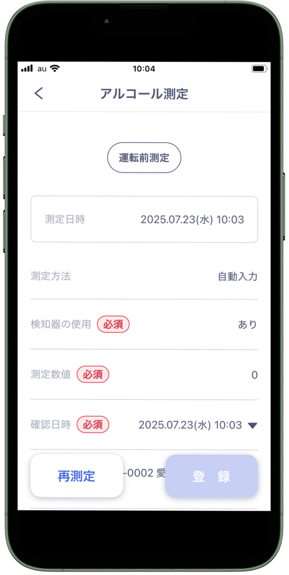 検知器とBluetooth接続することで、測定結果などの情報は自動入力されるため、その他必要な情報を入力します。入力したら登録ボタンを押してアルコールチェック記録の提出完了です。