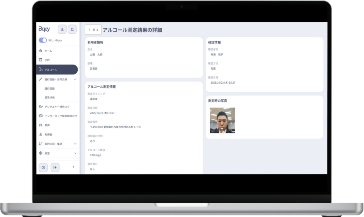 法改正により安全運転管理者の業務に追加されたアルコールチェックについて、車両管理システムを用いた運用方法の一例として、弊社システム「Bqey(ビーキー)」を用いて解説します。