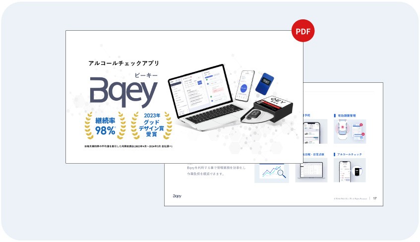 アルコールチェックアプリBqey(ビーキー)をご紹介 Home 資料ダウンロード アルコールチェックアプリBqey(ビーキー)をご紹介 この資料でわかること Bqeyの機能や導入メリット 実際の画面や操作イメージ Bqeyで飲酒運転リスクを仕組みで防いだ事例など