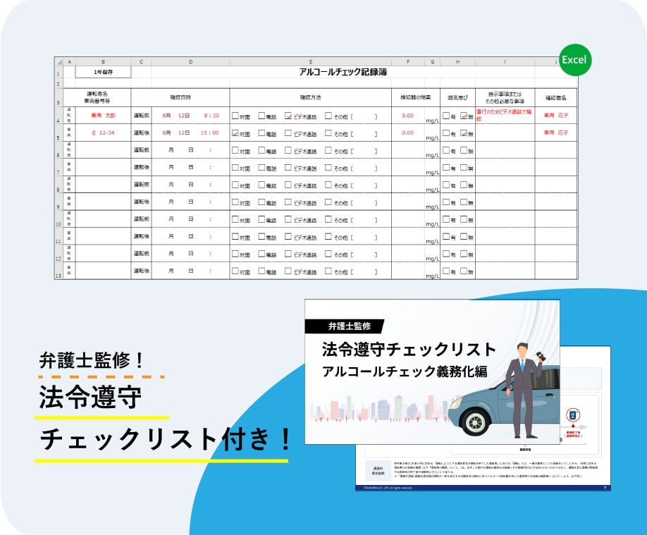 アルコールチェック記録簿テンプレート(法令遵守チェックリスト付き)